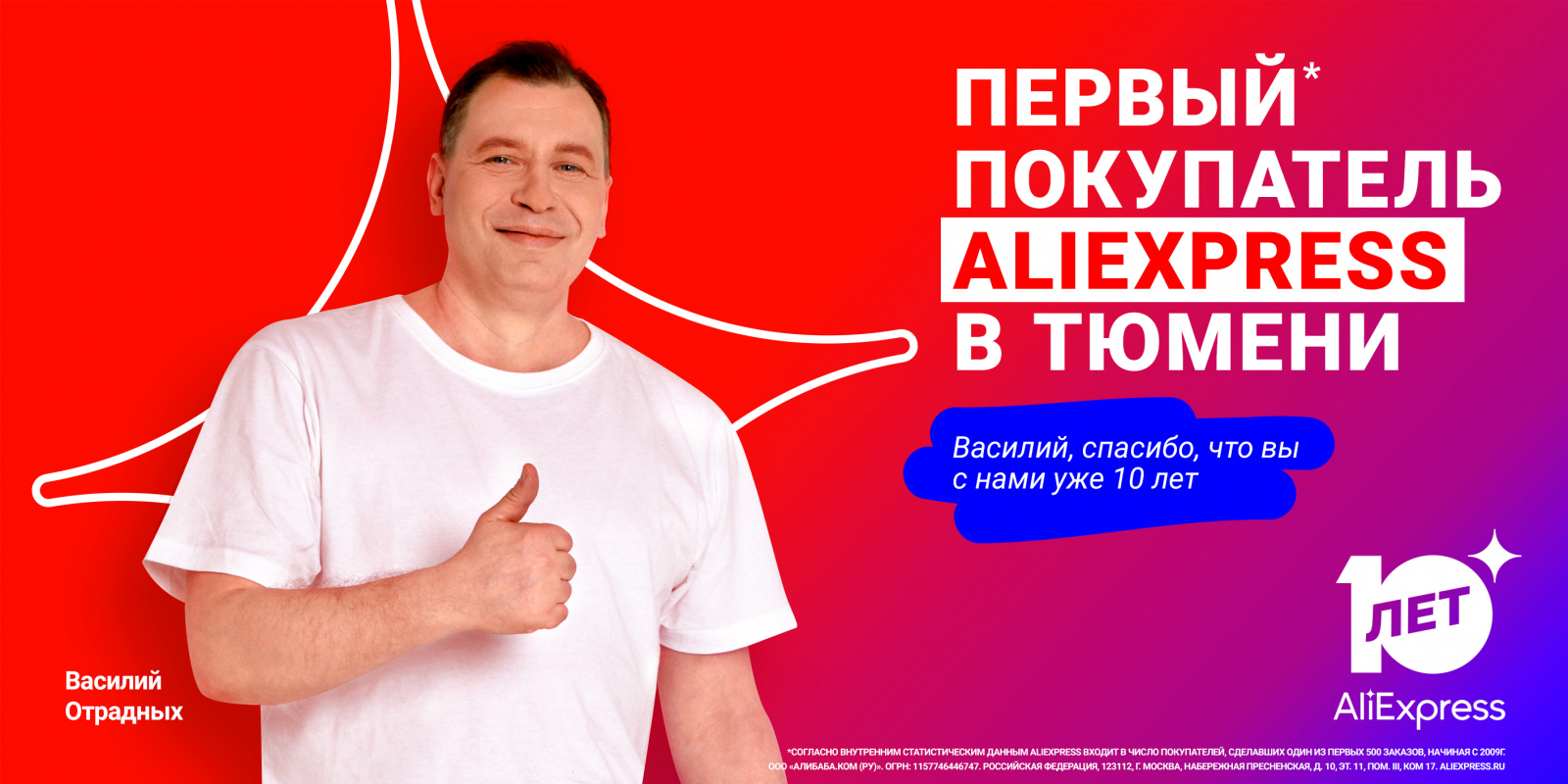 Готовясь к десятилетию площадки, мы подумали, что будет здорово найти пользователей, которые были с нами с самого начала. Тех, кто стал нашим покупателем десять лет назад и остается им до сих пор. Эти люди — главные амбассадоры AliExpress, которым мы хотим сказать «Спасибо» максимально ярко, чтобы каждый город увидел своего героя. Мы отбирали героев из первых 500 покупателей и пообщались с ними лично. Выбрали по одному пользователю из каждого города и провели с ними фотосессию, чтобы подготовить персональные билборды с благодарностью и разместить в их родных городах.