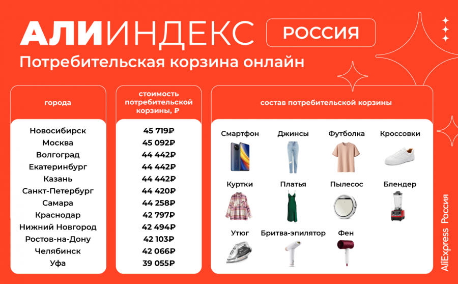 «AliExpress Россия» представила обновленный «АлиИндекс» за первое полугодие 2021 года. Это усредненный набор популярных товаров в разных категориях, в основе рейтинга — средняя стоимость товаров в этих категориях и их доля в общем бюджете онлайн-корзины. В дальнейшем индекс будет обновляться дважды в год, рассказали Sostav в компании.