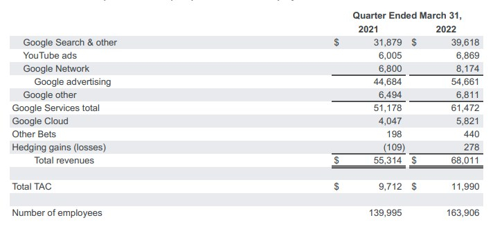 Alphabet, материнская компания Google, опубликовала финансовую отчётность за первый квартал 2022 года. Согласно данным компании, выручка увеличилась на 23% год к году и достигла $68 млрд благодаря повышению доходов от рекламы и облачных сервисов.