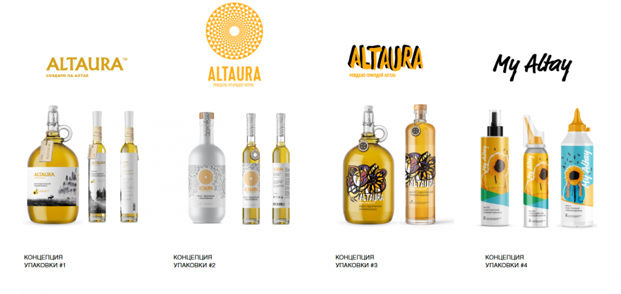 Первое направление получило рабочее название «Часть первозданной природы Алтая», и здесь были разработаны названия Altayreserve и «Алтариа» (Altaria). Второе направление — «Заповедный дух Алтая» — породило неймы «Алтаура» (Altaura) и «Алтаик» (Altaiq).