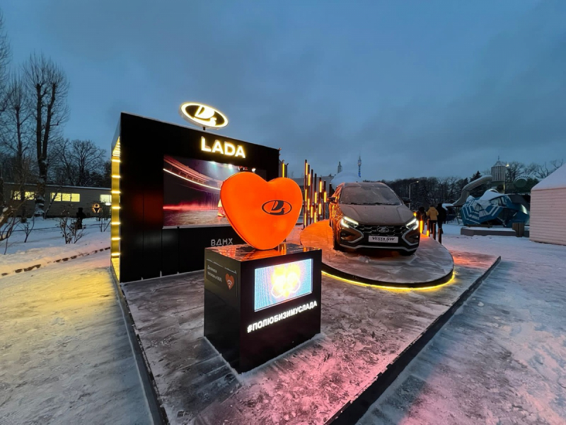 Работа над проектом Lada на катке ВДНХ велась в течение трех месяцев, включая разработку концепции и промо-механики, согласование всех деталей как с клиентом, так и с площадкой, производство стенда и всех необходимых материалов, подбор и обучение персонала. Яркая и теплая бренд-зона Lada открылась для посетителей в конце ноября. На высоком подиуме экспонировался автомобиль Lada Vesta и размещался экран, где транслировались фотографии посетителей катка и рекламные ролики Lada. Гости стенда могли погреть руки у теплой конструкции в виде сердца и поставить лайк зиме с помощью специальной кнопки.