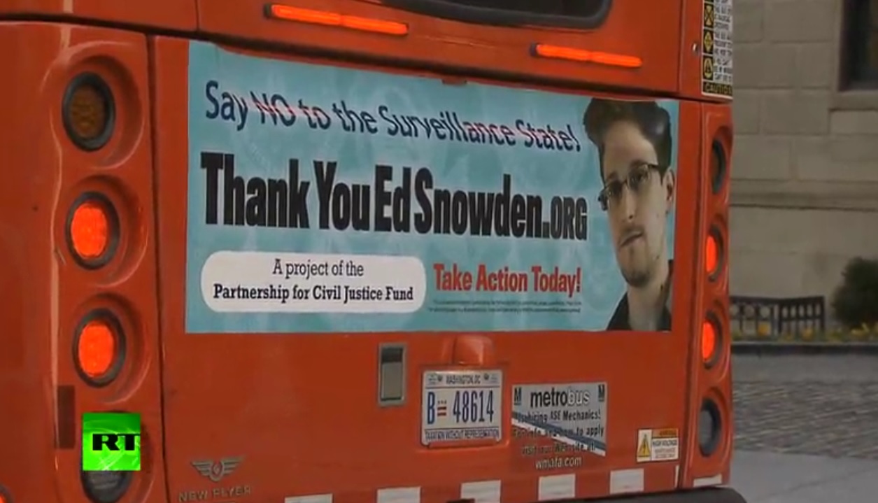 Американский Фонд партнерства гражданского правосудия (Partnership for Civil Justice Fund, PCJF) запустил кампанию в поддержку Эдварда Сноудена. Реклама появилась на автобусах в столице США – Вашингтоне. Таким образом жители выражают свой протест против шпионажа и благодарность бывшему сотруднику спецслужб.