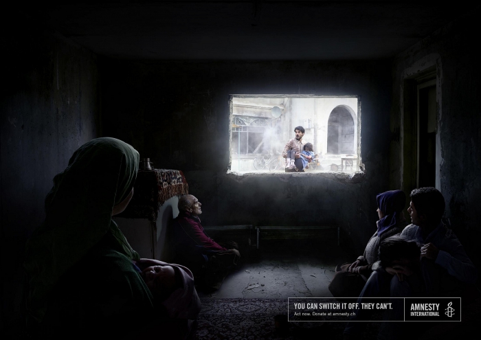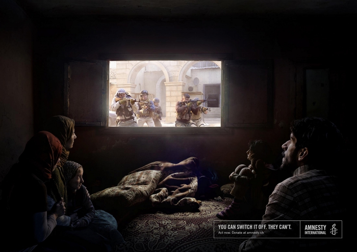 Креативная команда агентства Ogilvy (Франкфурт) вместе с Amnesty International запустили социальную кампанию об ужасах войны. Для большинства из нас кровь и смерть бывают лишь на экранах телевизоров, и мы в любой момент можем переключить канал. Но люди, изображенные на постерах, этого сделать не могут: для них война - не просто кино или сюжет в новостях, для них это повседневная реальность.