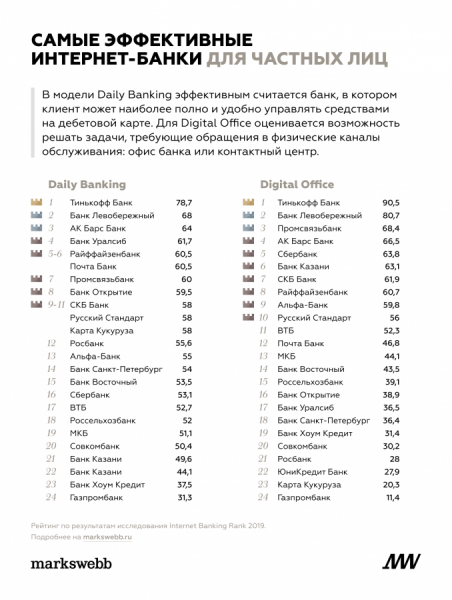 Тинькофф Банк, набрав 78,7 баллов из 100 возможных, вернул себе первое место в рейтинге Internet Banking Rank 2019 для частных лиц, ежегодно составляемом компанией Markswebb Rank & Report. На втором месте Банк Левобережный. Третью позицию в рейтинге, составленном по модели Daily Banking (оценивается удобство управление средствами на дебетовой карте), новый участник рейтинга — банк АК Барс. Промсвязьбанк занял третью строчку в рейтинге по модели Digital Office, где оценивалась возможность решения задач, требующих обращения в физические каналы обслуживания: офис банка или контактный центр.