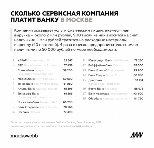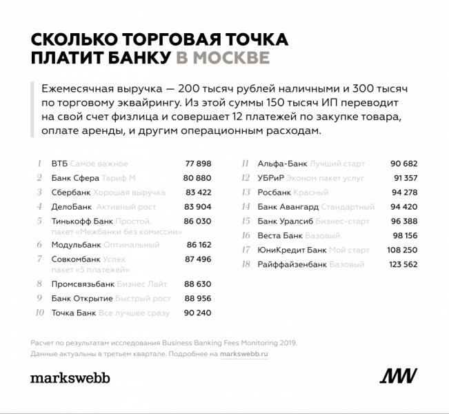 Тарифные справочники банков обновляются с космической скоростью: небольшие изменения происходят почти каждый день, и иногда довольно заметно влияют на стоимость обслуживания бизнеса. В рамках исследования Business Banking Fees Monitoring аналитики Markswebb проанализировали все обновления тарифных справочников в третьем квартале 2019 года и рассчитали, сколько за год платят банку фрилансер в форме ИП, торговая точка и небольшая сервисная компания.