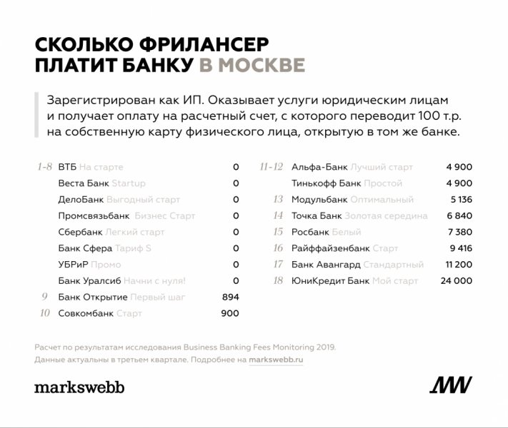В результате исследования выяснилось, что фрилансер, который зарегистрирован как ИП, в третьем квартале 2019 года может совершенно бесплатно обслуживаться в восьми банках: ВТБ, «Веста Банк», «ДелоБанк», «Промсвязьбанк», Сбербанк, «Сфера», УБРиР и Уралсиб. Во всех банках, кроме ВТБ, обслуживание было бесплатным и во втором квартале.