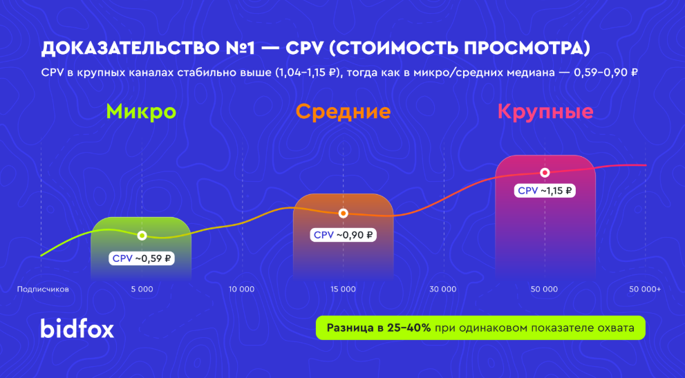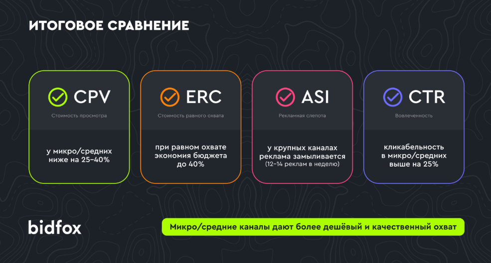 В Bidfox отмечают, что не стоит гнаться только за статусом и громким охватом. Каждый просмотр в крупных Telegram-каналах обходится дороже. Малые и средние каналы дают лучшую экономику, при том же бюджете они позволяют получить больший объем просмотров. Рекламодателям стоит выбирать рациональную стратегию — комбинировать крупные каналы (для имиджа и статуса) с набором мелких и средних каналов (для эффективности). Рекомендуется делать ставку на микро- и средние каналы, т. к. именно здесь достигается максимальная экономия бюджета и лучший отклик аудитории.