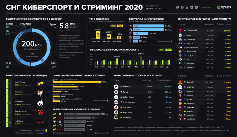 Аналитики Esports Charts представили анализ рынка киберспорта и стриминга в СНГ по итогам 2020 года. Эксперты проанализировали русскоязычные трансляции 1,5 тысяч турниров на платформах Twitch, YouTube, Facebook, VK, Steam.tv, Goodgame, Trovo и AfreecaTV. Сервис выявил наиболее популярные дисциплины, стримеров, организации и студии.