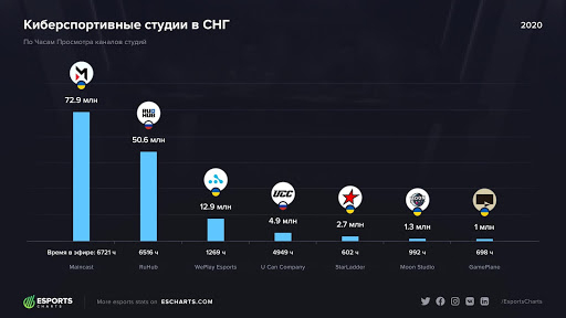 Самой популярной русскоязычной киберспортивной студией в 2020 году стала Maincast, ее суммарное время в эфире составило 6,7 тыс. часов. Студия транслировала соревнования по Dota 2, CS:GO, StarCraft II, Quake и FIFA.