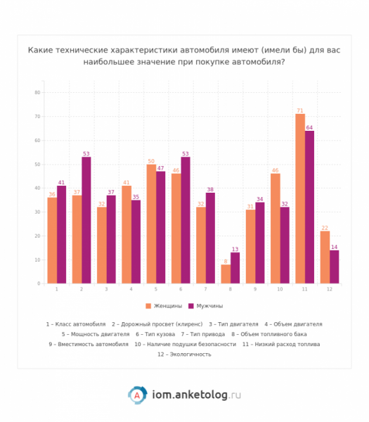 Наиболее важная характеристика при его покупке — это его класс, причем это утверждение справедливо и для мужчин (64%), и для женщин (64%). На втором месте по значимости у мужчин находятся такие характеристики как клиренс и тип кузова (по 53%), а женщины предпочитают интересоваться мощностью двигателя (50%). У мужчин этот показатель на третьем месте (47%), а для 46% женщин оказался важен тип кузова.