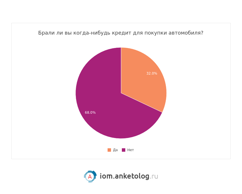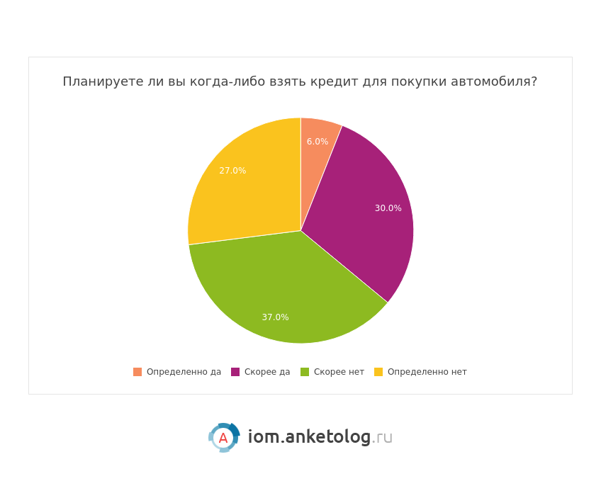 При этом 68% опрошенных никогда не брали кредит на покупку автомобиля, и невелико число тех, кто собирается брать автокредит — их всего 6% против 27% тех, кто не собирается этого делать. При этом 30% склоняются к мнению, что скорее готовы взять кредит и 37% больше уверены в том, что не будут этого делать.