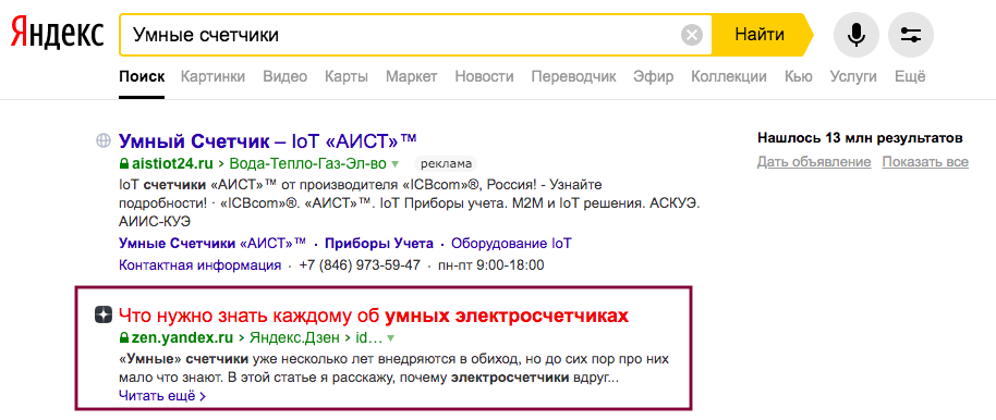 Поисковая выдача. Все публикации «Дзена» индексируются и отлично ищутся по ключевым словам: «Яндекс» поддерживает свои сервисы, поэтому даже на простой запрос релевантные публикации «Дзена» выводятся на первых строчках.