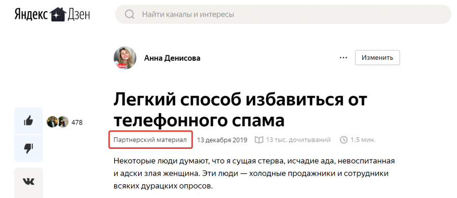 Материалы с нативной рекламой показываются в ленте без пометок. Но во всех рекламных публикациях, включая авторские, есть предупреждение для читателей о партнерском материале внутри статьи: