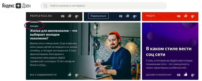 Вид в ленте. При платном продвижении «Дзен» показывает превью материала в определенных местах ленты со значком «ПРОМО». Больше они ничем не отличаются от обычных авторских публикаций.