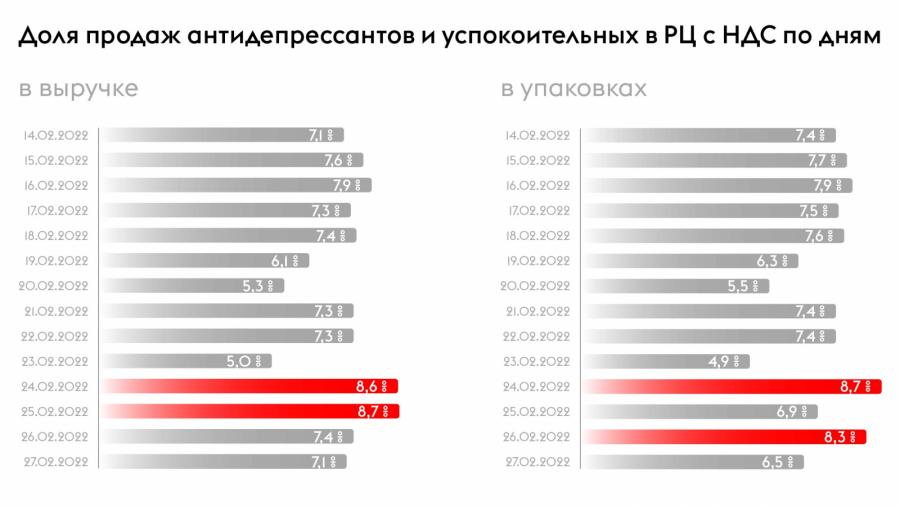 По данным аналитиков группы компаний «Асна», в первые дни после объявления о начале специальной военной операции на Украине (24−26 февраля) в российских аптеках увеличились продажи антидепрессантов и успокоительных средств. Продажи в рублях в категории «антидепрессанты» на девятой неделе текущего года показали рост на 7,1% относительно восьмой недели, «успокоительные» — на 1,2%. Результатами исследования с Sostav поделились в «Асна».