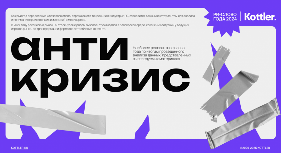Антикризисный PR стал главным направлением работы специалистов по коммуникациям в 2024 году. Если раньше пиарщики занимались в первую очередь продвижением брендов, сегодня их главная задача — защита репутации компаний и персон. Такой вывод сделали эксперты коммуникационного агентства Kottler, проанализировав публикации по теме PR за 2024 год. Представители агентства поделились с Sostav итогами исследования. Ключевым словом года в индустрии стало «антикризис».