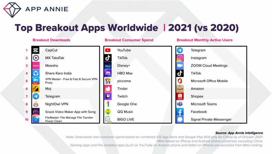 Среди приложений первое место по числу скачиваний за 2021 год занял видеоредактор CapCut. В десятку самых частых загрузок входит Telegram. Он же занял первое место по числу ежемесячно активных пользователей. Пользователи проявляли активность также в Instagram, Zoom и TikTok.