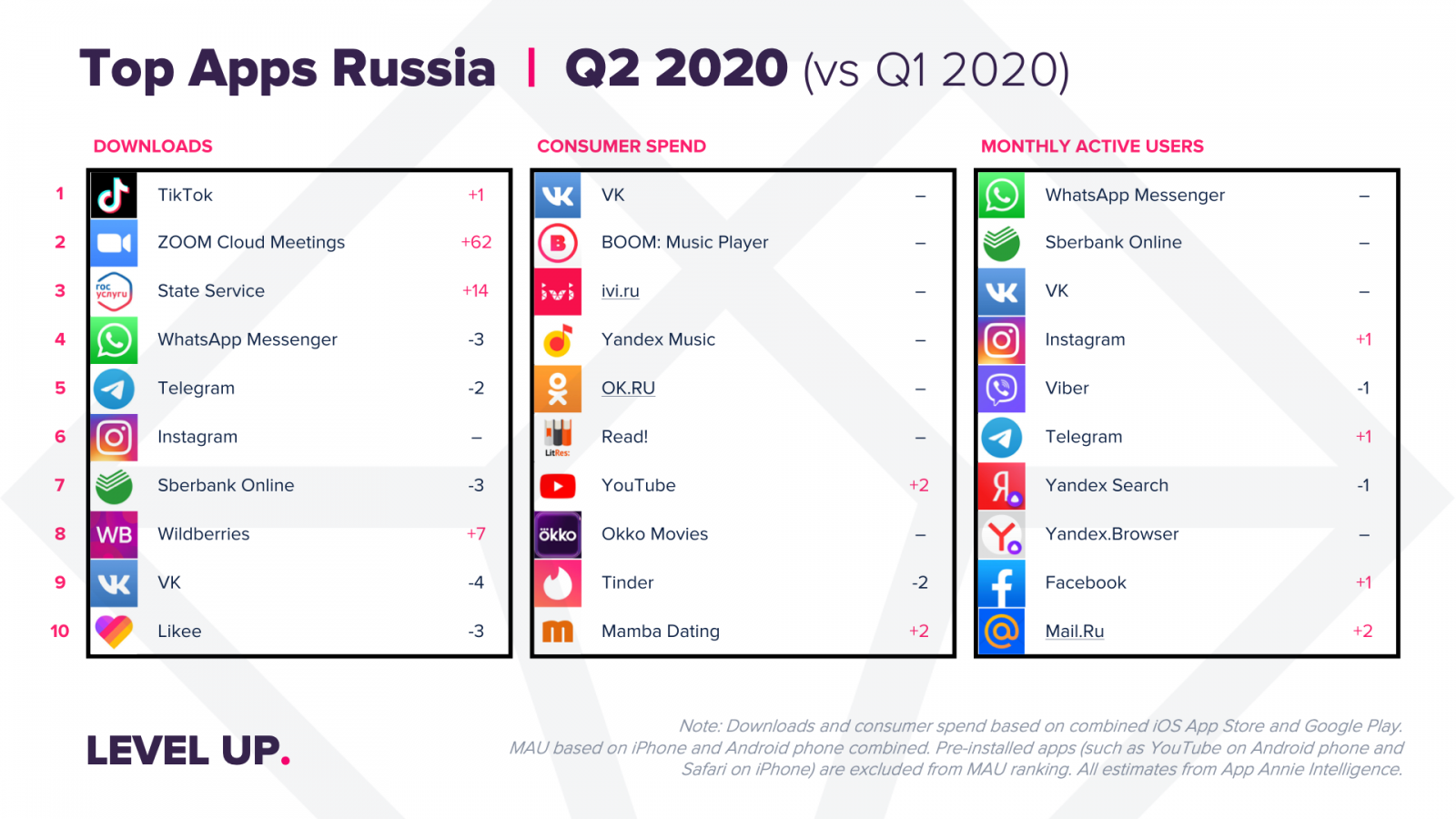 TikTok занял первое место по количеству установок в России за второй квартал 2020 года, следует из отчета аналитической платформы AppAnnie (есть в распоряжении Sostav). Следом за соцсетью идут Zoom, «Госуслуги», WhatsApp и Telegram. При этом в мире TikTok занял первое место не только по скачиваниям, но и тратам, а также седьмое по проведенному времени.
