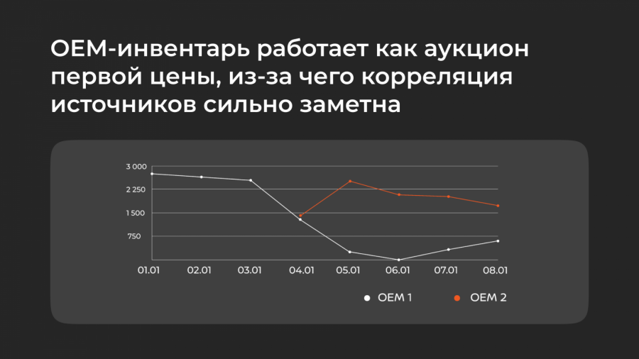 Основная сложность в работе с OEM-источниками — аукцион первой цены. Это значит, что вы покупаете трафик ровно за ту цену, которая указана в кабинете, независимо от результатов аукциона. Это приводит к перегреву аукциона и большому количеству пересечений трафика. Чтобы избежать большой корреляции источников в OEM-кампаниях, следуйте следующему алгоритму.