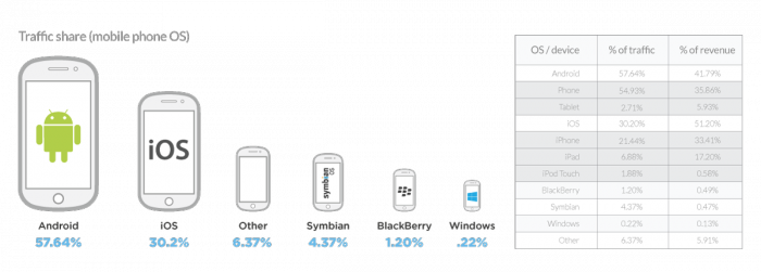 Согласно отчету State of Mobile Advertising, подготовленному компанией Opera Mediaworks, Apple по-прежнему лидирует по доходам от мобильной рекламы, несмотря на растущий трафик Android (63%).