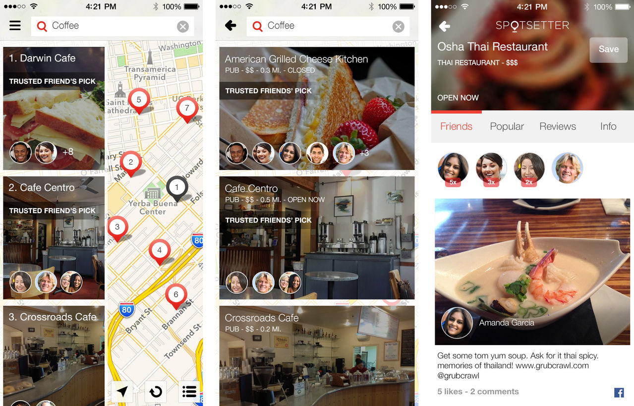 Spotsetter позволяет не только искать места на карте, но также получать персонализированные рекомендации, для составления которых поисковик использует информацию с аккаунтов друзей по таким социальным сетям как Facebook, Twitter, Instagram и Foursquare.