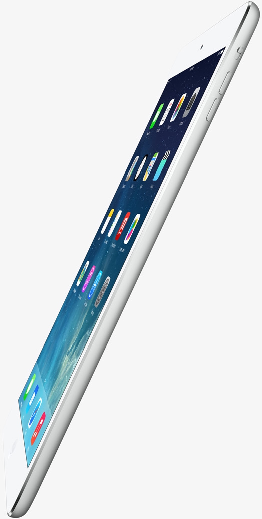 Новый полноразмерный планшет получил имя iPad Air и стал тоньше и легче своих предшественников, так, вес «воздушного» компьютера составляет 450 грамм против 660 грамм у предыдущей модели, а толщина - 7,5 мм против 9,4 мм.