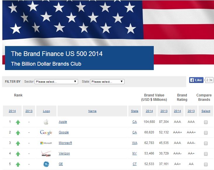 Самым дорогим брендом в США является Apple, подсчитали эксперты Brand Finance. Торговая марка корпорации возглавила TOP-500 с оценкой в 104,7 млрд долларов. За год бренд IT-корпорации подорожал почти на 20% — в 2013-м он стоил 87,3 млрд долларов.