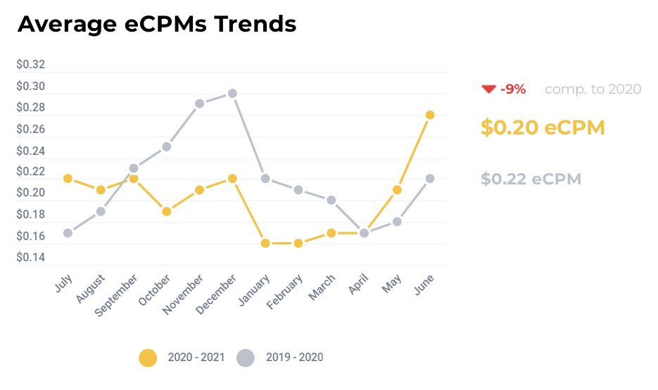 По сравнению с прошлым годом eCPM вознаграждаемой видеорекламы на iOS просел практически во всех регионах как на Android, так и на iOS. Сильнее всего снижение показала Восточная Европа.
