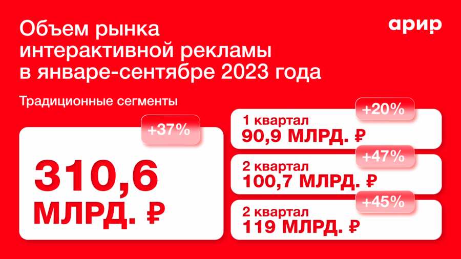 Эксперты Ассоциации развития интерактивной рекламы (АРИР) подсчитали объём рынка традиционных сегментов интернет-рекламы по итогам трёх кварталов 2023 года. Инвестиции составили 310,6 млрд руб. без НДС, что на 37% больше по сравнению с аналогичным периодом прошлого года. Об этом Sostav сообщили в ассоциации.