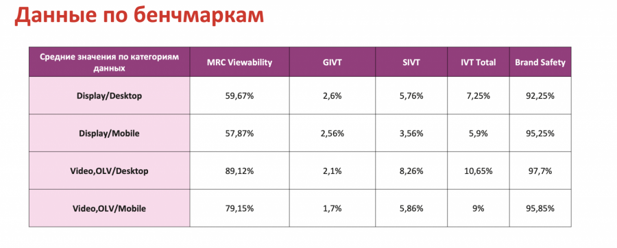 Другие бенчмарки испытали значительное падение. Так, Sophisticated Invalid Traffic (SIVT) — недействительный трафик, требующий расширенного анализа для идентификации — сократился на несколько пунктов по всем категориям данных. Самое низкое значение зафиксировано в формате мобильной баннерной рекламы — 3,56%. Более заметная доля недействительного трафика приходится на десктопную видеорекламу (8,26%).