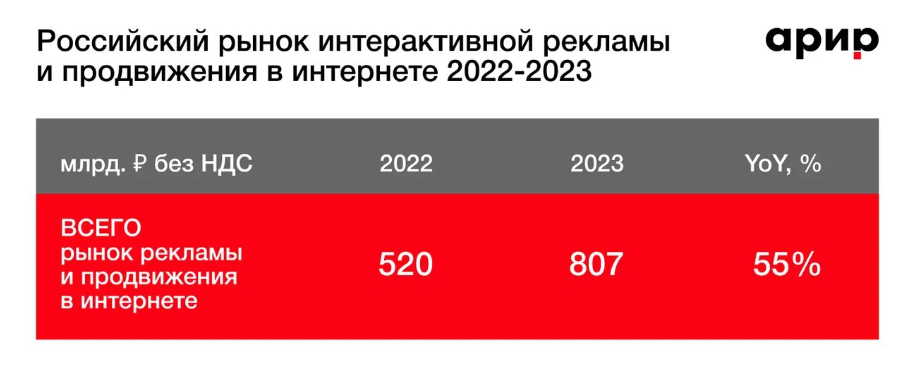 Объем российского рынка интерактивной рекламы и продвижения в интернете увеличился на 55% и составил 807 млрд руб. в 2023 году, подсчитали в Ассоциации развития интерактивной рекламы (АРИР). Вложения в традиционные сегменты выросли на 32% и достигли 427,6 млрд руб. Инвестиции в инновационные форматы — на 93% до 379,6 млрд руб.
