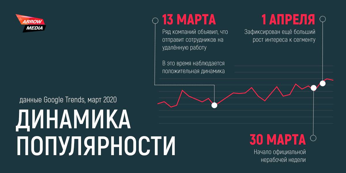 Если смотреть график данных Google Trends за март 2020 года, то мы видим положительную динамику с 13 марта — даты объявления части компаний о переводе сотрудников на удаленную работу. И второй скачок с 30 марта — начало официальной «нерабочей» недели.