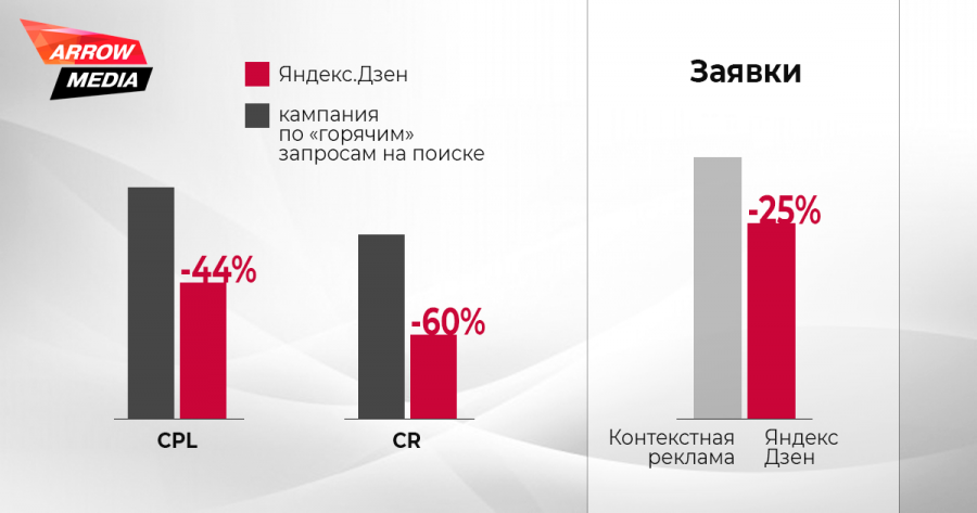 Платное продвижение статей в «Яндекс.Дзене» было дешевле на 44% за лид с CR на 60% ниже, чем в кампании по «горячим» запросам на поиске. Низкий CPL получили с помощью верно выбранной стратегии — оплата за дочитывания. Объем заявок с «Дзена» получился всего на 25% меньше, чем с контекстной рекламы.