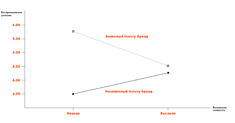 Результаты двух экспериментов показали, что респонденты, знакомые с классическим стилем роскоши, считали, что бренд выглядит дороже, если изображение менее сложное. Но если они встречались с незнакомым брендом, то более сложное изображение казалось им визуально дороже, чем простое.
