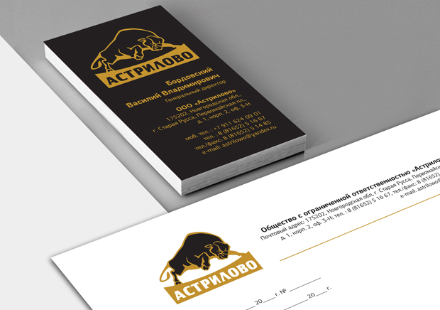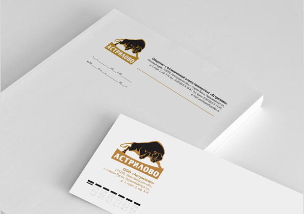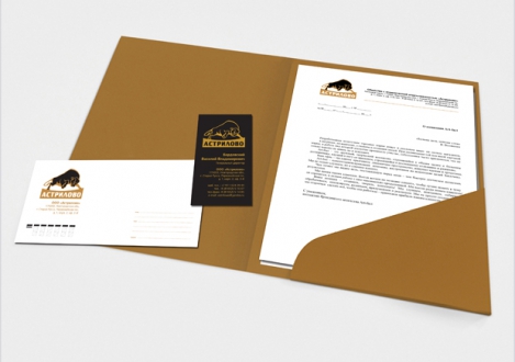 Для ООО «Астрилово» был разработан малый пакет элементов корпоративной идентификации: бланки, конверты разных форматов, папка, шаблон визитки.