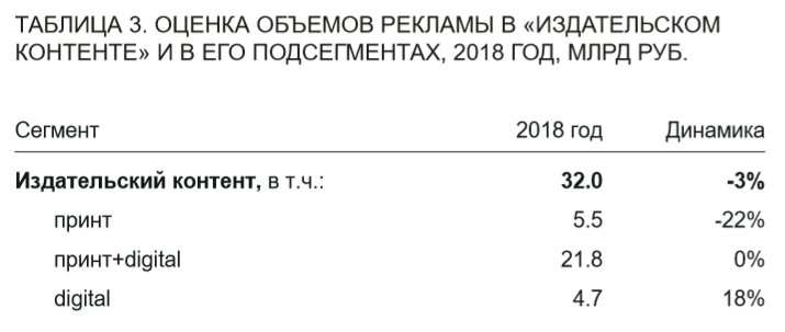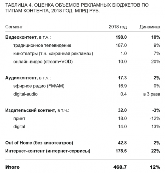 В результате проведенной работы по разработке новой классификации были выделены три сегмента по типу контента: видеоконтент, аудиоконтент и издательский контент. Во избежание путаницы, в финальную (сводную) версию таблицы оценки рекламного рынка по типам контента были включены оставшиеся сегменты медиарекламного рынка, а именно сегмент интернета (включая интернет-сервисы, но исключая объемы рекламы, полученные при потреблении видео-, аудио- и издательского контента в digital-среде) и сегмент Out of Home (за вычетом «экранной» рекламы в кинотеатрах), который является в чистом виде рекламой, распространяемой вне профессионального медийного контента (см. Таблицу 4).
