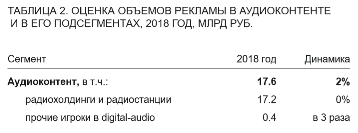 Оценка данного сегмента соответствует заявленной методике, согласно которой учитываются все возможные способы рекламной монетизации профессионального (издательского) аудиоконтента, а именно: