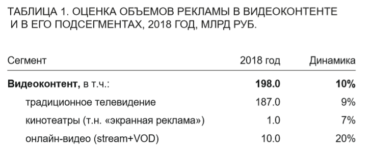 Эксперты рабочей группы по оценке объемов рекламных бюджетов в видеоконтенте выделили три подсегмента, отражающие распространение видеоконтента в разных средах — традиционное телевидение, кинотеатры и интернет. В подсегмент традиционного телевидения включены бюджеты, полученные от размещения прямой и спонсорской рекламы в прямом эфире телеканалов. В подсегмент кинотеатров включены рекламные доходы от показа рекламы на экранах в кинотеатрах перед началом показа фильма (так называемая экранная реклама). Подсегменты телевидения и кинотеатров оцениваются АКАР в рамках традиционной классификации, и объемы по ним были полностью взяты из официальной оценки Ассоциации. Поэтому в данном случае имеет место лишь перераспределение подсегментов в рамках старой классификации.