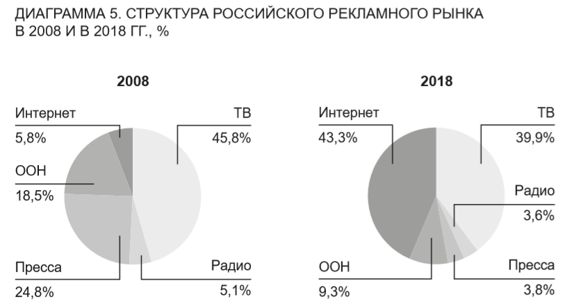 За последние 20 лет медиапотребление и медиарынок претерпели драматические изменения, главным образом в связи появлением и распространением интернета. Изначально интернет функционировал как средство обмена информацией, а контент, производимый в нем, монетизировался баннерами. Чуть позже появились поисковые сервисы и контекстные рекламные объявления, которые показывались на основе поисковых запросов пользователей. В 2008 году интернет был включен АКАР в оценку рынка как отдельное медиа. Эксперты АКАР также провели ретроспективную оценку, согласно которой, первые рекламные бюджеты пришли в российский интернет в 2002 году1, хотя специалисты Zenith полагают, что первые более или менее заметные рекламные бюджеты в отечественной интернет-рекламе были еще в 1999 году2. Тогда, в 2008 году, после ряда оценок, уточнений и переоценок, эксперты пришли к выводу, что на долю интернета пришлось чуть менее 6% от всех рекламных бюджетов на рынке. Но за последние 10 лет ситуация кардинально изменилась. Технологические изменения в области создания, хранения и распространения информации породили процессы, которые привели к глубокому и масштабному изменению информационной, социальной и экономической систем.