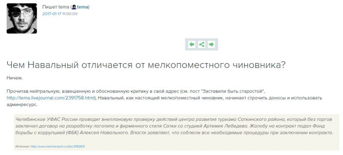 Фонд борьбы с коррупцией (ФБК) Алексея Навального строчит доносы на Студию Артемия Лебедева с использованием админресурса, заявил дизайнер. Поводом для возмущения стала новость из Челябинской области: там региональное управление ФАС проводит внеплановую проверку госконтракта на создание логотипа и фирменного стиля города Сатки. Ведомство сообщило, что обращение поступило от ФБК.