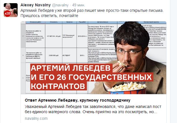 Оппозиционер уже опубликовал ответ Лебедеву. Навальный рассказал, что решил напомнить Артемию и его сторонникам о реальных проектах ФБК, «созданных в условиях противодействия власти». По открытым данным был составлен список госконтрактов, полученных студией Лебедева. По большинству из них не было никаких сведений, что противоречит и закону, и здравому смыслу, полагает Навальный. На официальных ресурсах скрыты контракты, стоимость и акты приёмки.
