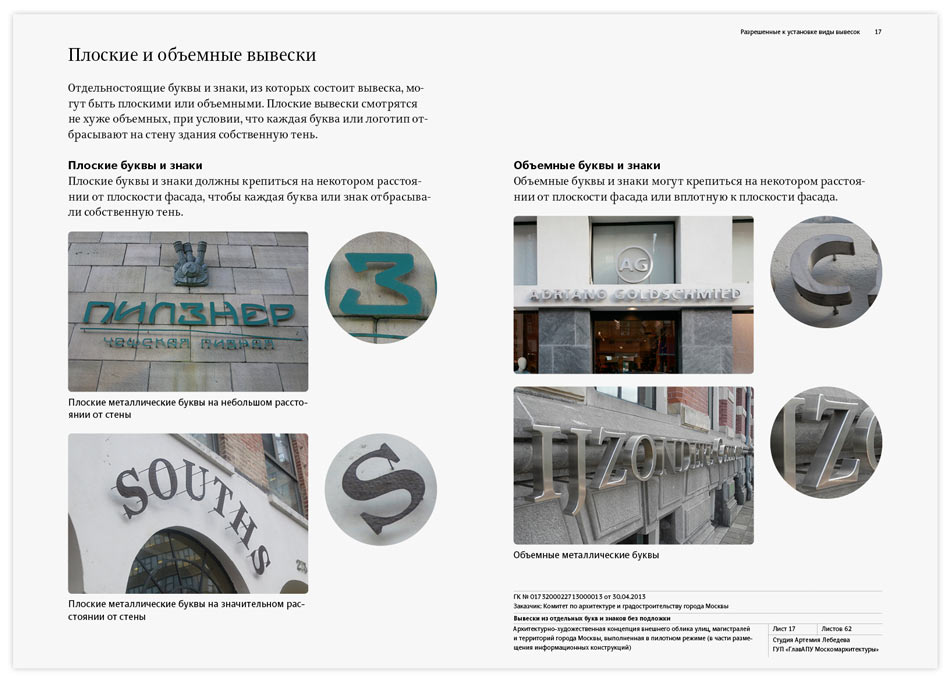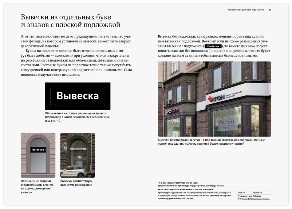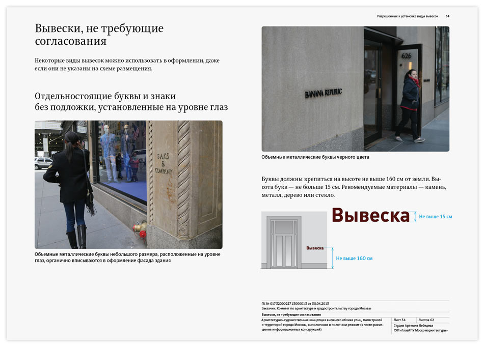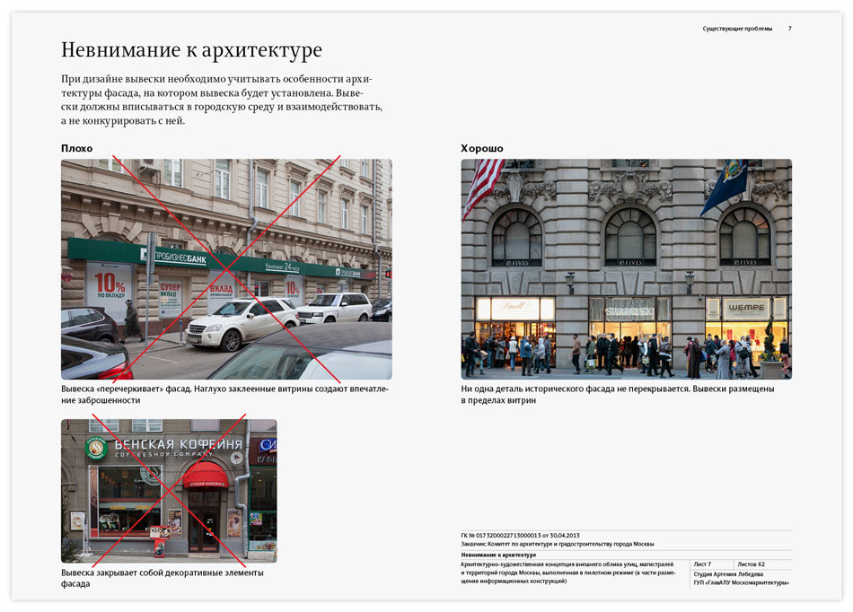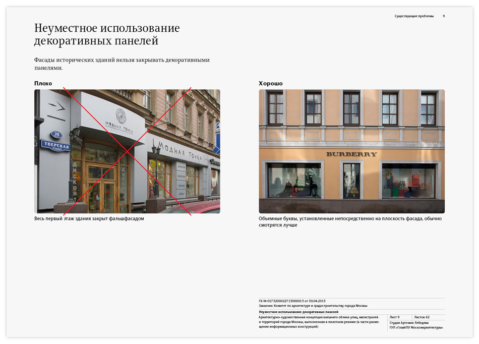 Проект Лебедева содержит общие рекомендации по оформлению и установке на фасадах разнообразных конструкций и варианты гармоничного размещения вывесок для всех зданий на улицах Большая Дмитровка, Петровка, Кузнецкий Мост, Рождественка, Тверская, 1-я Тверская-Ямская, Большая Садовая, Воздвиженка, Новый Арбат, а также в Столешниковом и Камергерском переулках.