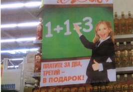 Ленинградское УФАС оштрафовало торговую сеть «Ашан» на 150 тыс рублей. Ритейлера наказали за рекламу, в которой использовался образ школьницы. Плакаты были размещены в магазине на стеллажах с алкогольной продукцией. Реклама сопровождалась надписями «1+1=3; Платите за два, третий в подарок» и «1=2; Платите за один – второй в подарок!»