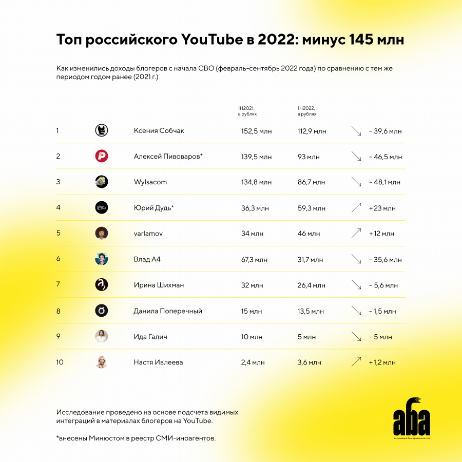 В Ассоциации блогеров и агентств (АБА) подсчитали, что с февраля по сентябрь 2022 года доходы топовых российских блогеров на YouTube снизились примерно на 23% год к году — как минимум на 145 млн руб. (результаты исследования есть в распоряжении Sostav).