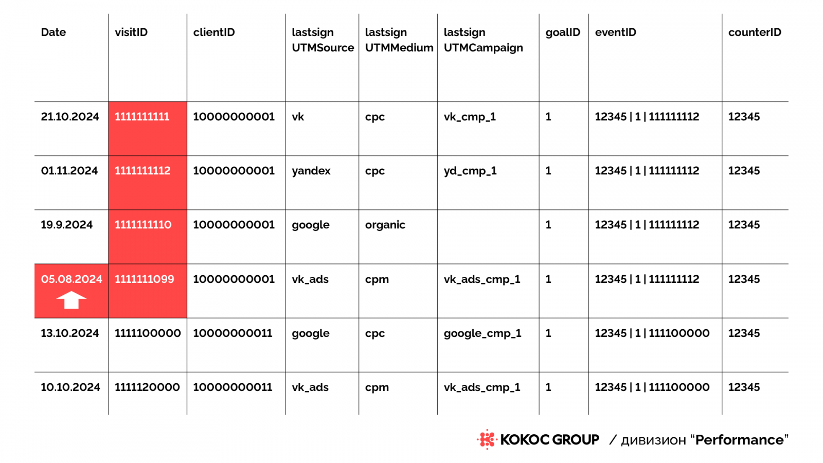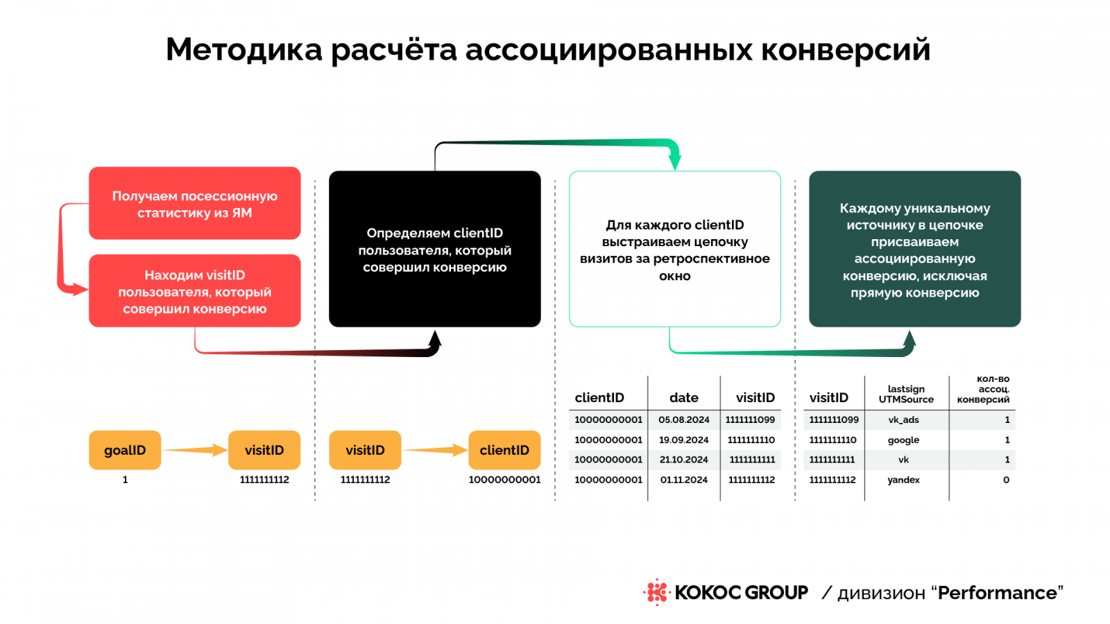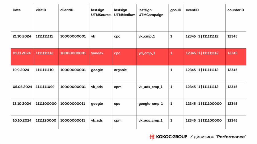 Для каждой конверсии (цели или транзакции) находим соответствующий ей visit_id — уникальный идентификатор визита. Каждому visit_id соответствует client_id — уникальный идентификатор пользователя, совершившего конверсионное действие в этой сессии.