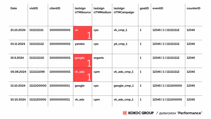 У пользователя с client_id 10000000001 получилась следующая цепочка: «VK Реклама» → Поиск google → «Реклама ВКонтакте» → «Яндекс Директ». Исключаем последний источник, который привел к прямой конверсии («Яндекс Директ»). Таким образом, для источников «VK Реклама», Поиск google, «Реклама ВКонтакте» будет засчитано по 1 ассоциированной конверсии.