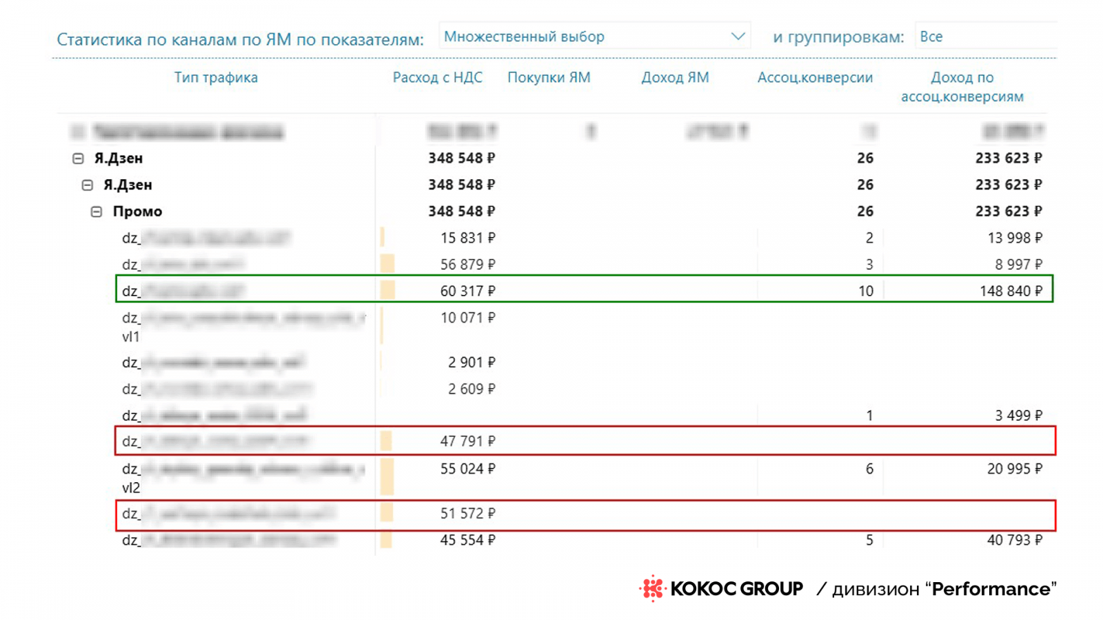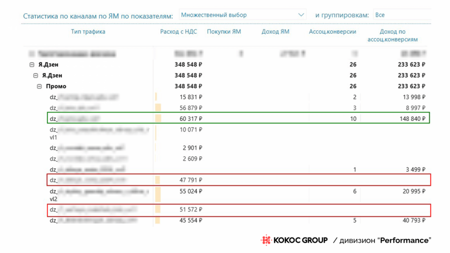 Переходим к практике. Смотрим на примере источника «Яндекс Промостраницы»: источник не приносил прямых конверсий. Однако за счет ассоциированных конверсий команда может принимать решение о том, какие кампании лучше отключить (выделены красным), а какие отключать не стоит (выделены зеленым), т. к. они принимают участие на пути пользователя к совершению конверсии.