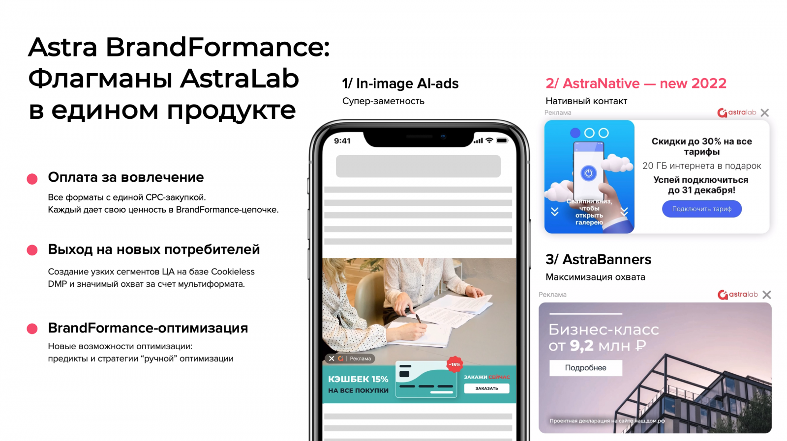 В BrandFormance-подходе AstraLab запустит новые продукты и обновит текущие форматы. Цель — увеличение итогового ROI имиджевой рекламы. Новый флагман — продукт Astra BrandFormance. Теперь все форматы AstraLab объединены в один с CPC-закупкой для оптимизации качества визитов и максимизации охвата узких сегментов потребителей.