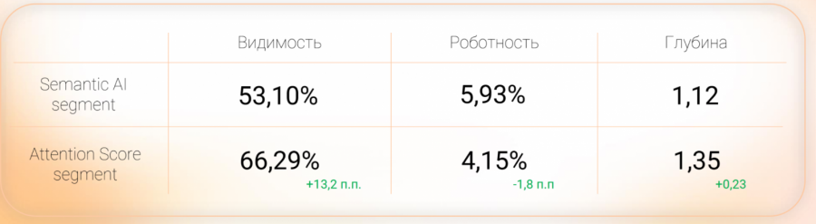В результате оптимизации кампании по метрике Attention Score мы улучшили такие показатели.