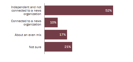 Половина опрошенных (52%) считает, что большинство инфлюенсеров, у которых они получают новости, независимы и не связаны с традиционными СМИ. Только 10% уверены, что блогеры работают с новостными организациями, а 17% видят «смешанную» модель. Еще 21% не знают, к какой категории отнести своих источников.